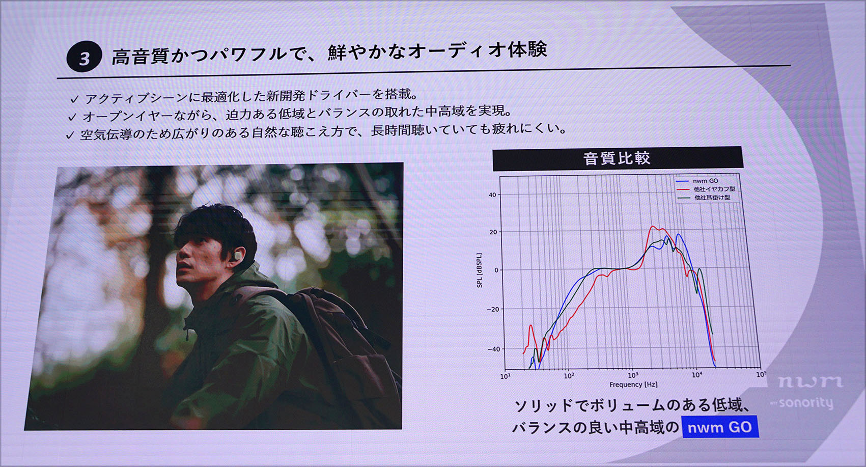 音質面では、『nwm GO』のために12mmドライバーを新開発。会場では他社製スポーツイヤホンとの測定値も発表されたが、低域のボリューム、高域の伸びなどの点で『nwm GO』が優れた特性を獲得していることが確認できた。坂井氏はクリアーながらソリッドでボリュームのある低域と、バランスの良い中域、伸びのある高域を実現したことで、長時間聴いていても疲れにくい自然な音を楽しんでもらえると話していた。