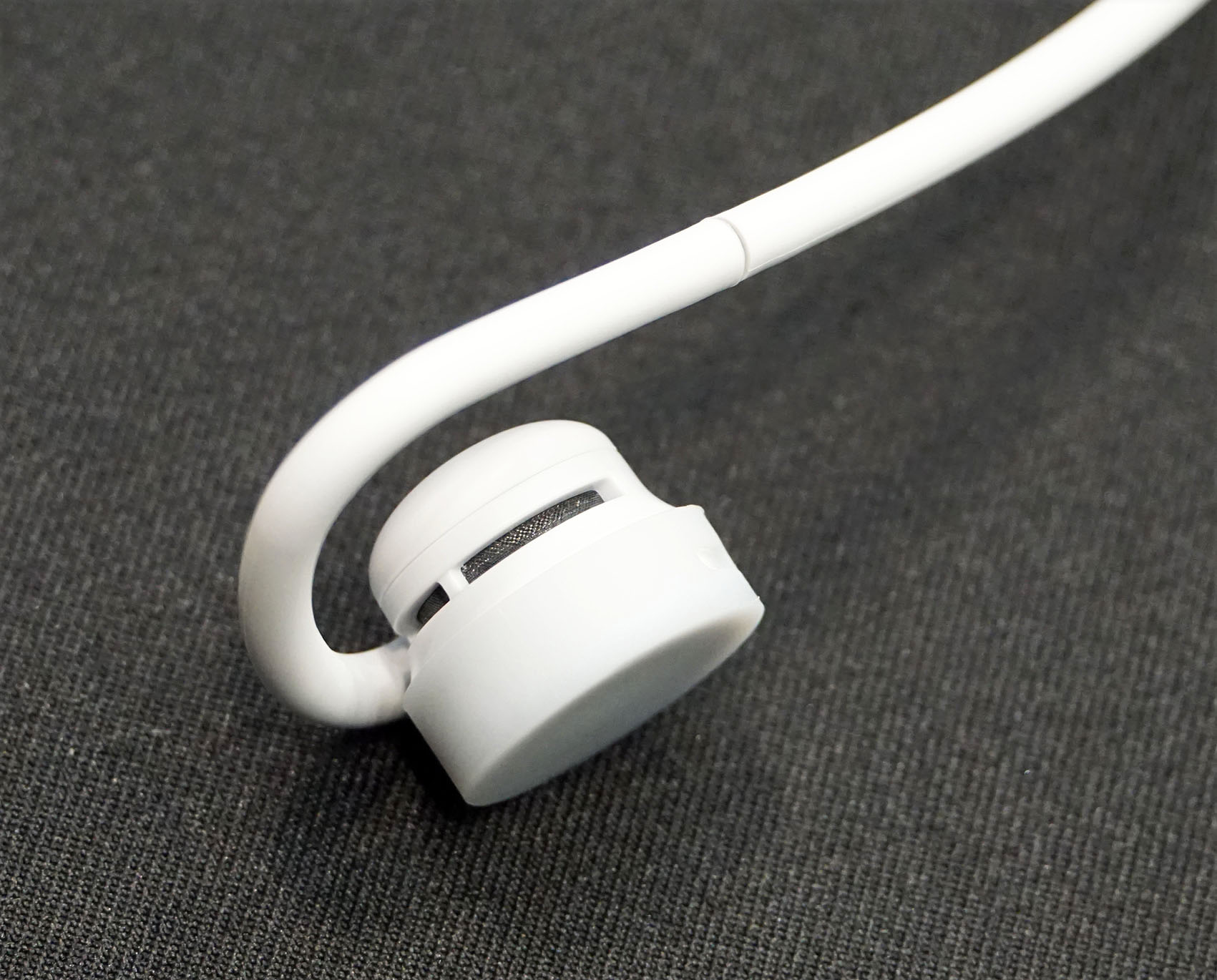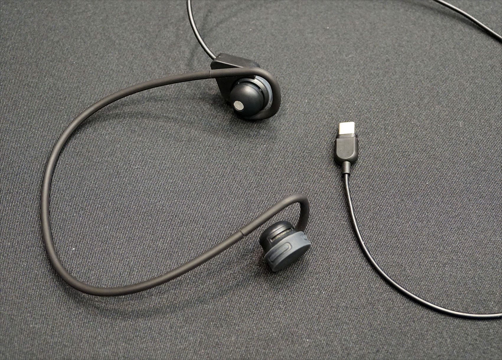 世の中的には左右分離型の完全ワイヤスレスイヤホン(TWS)が人気ですが、スポーツ用なら左右がつながっている方が落っこちることもないので安心です。左のイヤホンにはバッテリーが、右にはBluetoothなどの基板が入っていて、それを太さ4mmほどのワイヤーでつないでいます。この形にしたことでバッテリーの容量を大きくできました。ワイヤーはチタン合金で形状記憶特性も持っています。