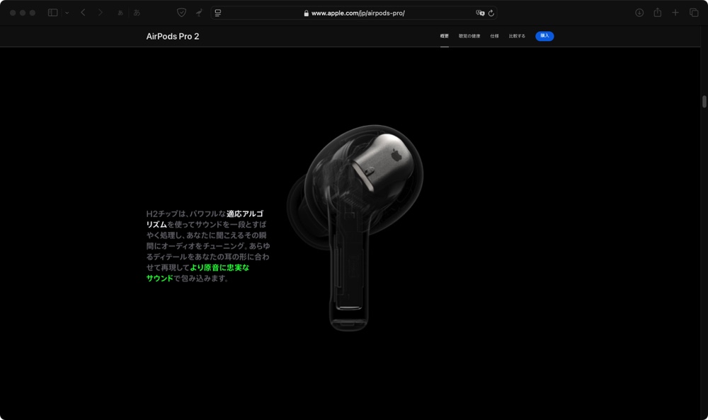 くわえて前機種との差として驚いたのは、耳の穴の形を変えるとサウンドが変わることだ。僕は耳を割と大きく上下に動かせるのだが、『AirPods Pro 2』はそういう動きに応じて最適なサウンドを送り込んでいるのだろう、明確にサウンドが変わってしまう。AppleのWebサイトによれば『AirPods Pro 2』に搭載されているH2チップがこうしたパーソナライズを司っているようだ。