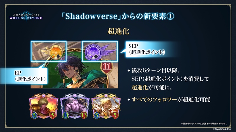 フォロワーが進化した時の攻撃力・体力の上昇値はそれぞれ+2、超進化した時はそれぞれ+3に固定される。さらに、持っているEPの数を先攻、後攻とも2ポイントに統一。「EP」と「SEP」は1戦の中でそれぞれ「2回」ずつ、合わせて「4回」使うことができる。
