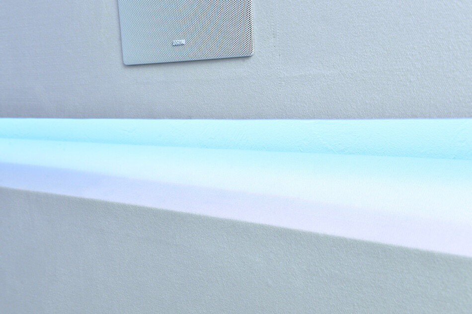 左手には隣の部屋でレコーディングをする際のアイコンタクト用に窓を設置。また、斜め後ろにドアを設置する関係で、サラウンドスピーカーの配置には難儀したそうだ。Dolby Atmosの規格の範囲内で、上から着座位置へ向かって角度を付けて設置。音響パネルも2段に分けて凹凸を付け、白の間接照明もオシャレに見せる。施工後の広さが約6畳という限られたスペースでも、このレベルの空間が提案できるというから、部屋が狭いと諦める必要はなさそうだ。