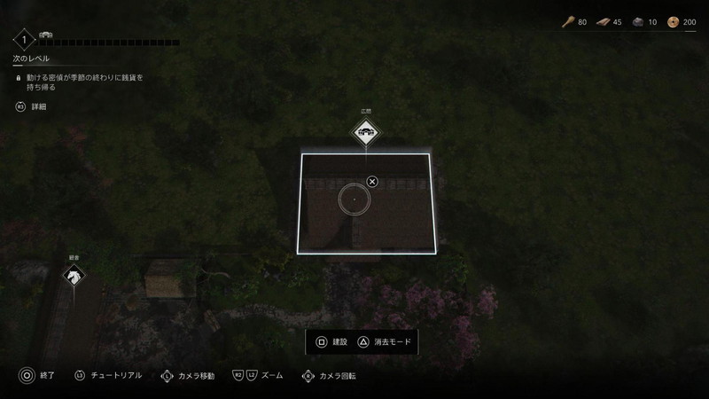 仲間キャラクターと交流したり、弥助や奈緒江の本音が聴けたりして、ストーリー理解や世界観構築には役立っているが、ハウジング要素としてはそこまで奥深くはなく、あくまで建物や設置物を上からポンポン置いていく程度のものである。