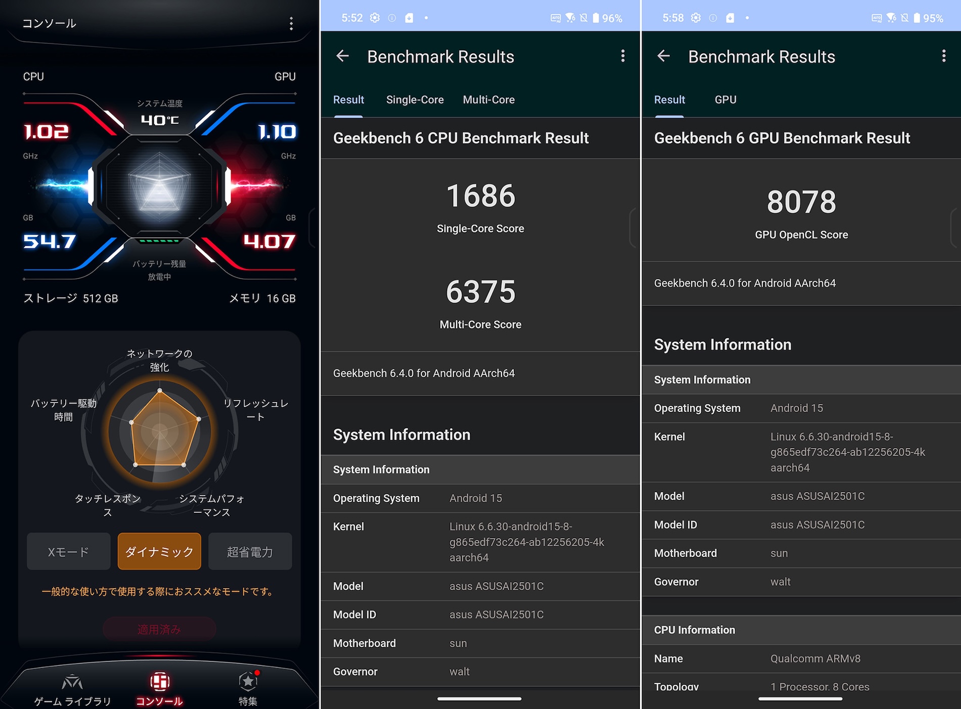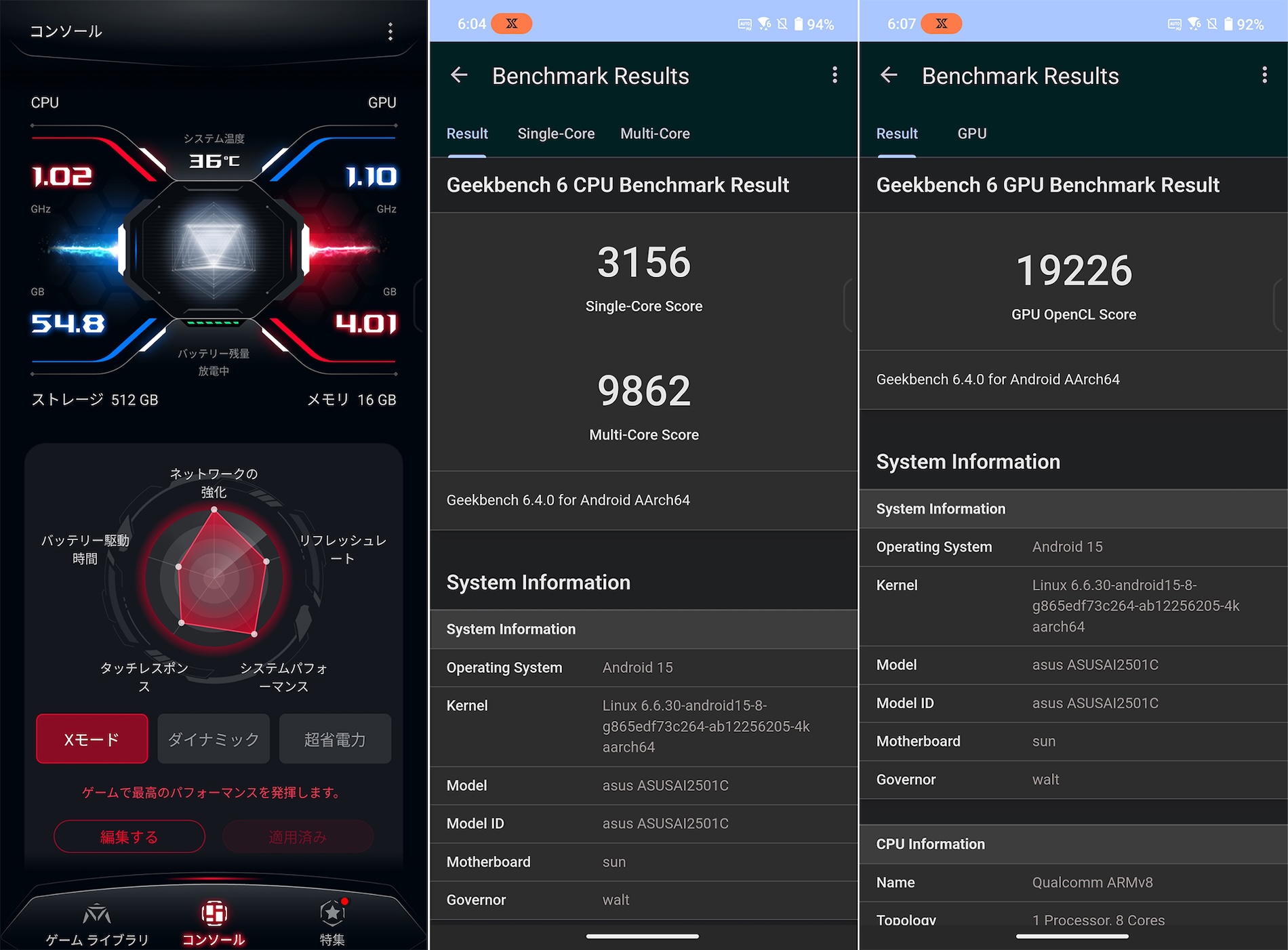 実際のところ、X-MODEにするとどれほど性能が向上するのか。一般的な使い方の際に選択するダイナミックモードとXモードとで、それぞれ『Geekbech 6』によるベンチマークをとってみた。