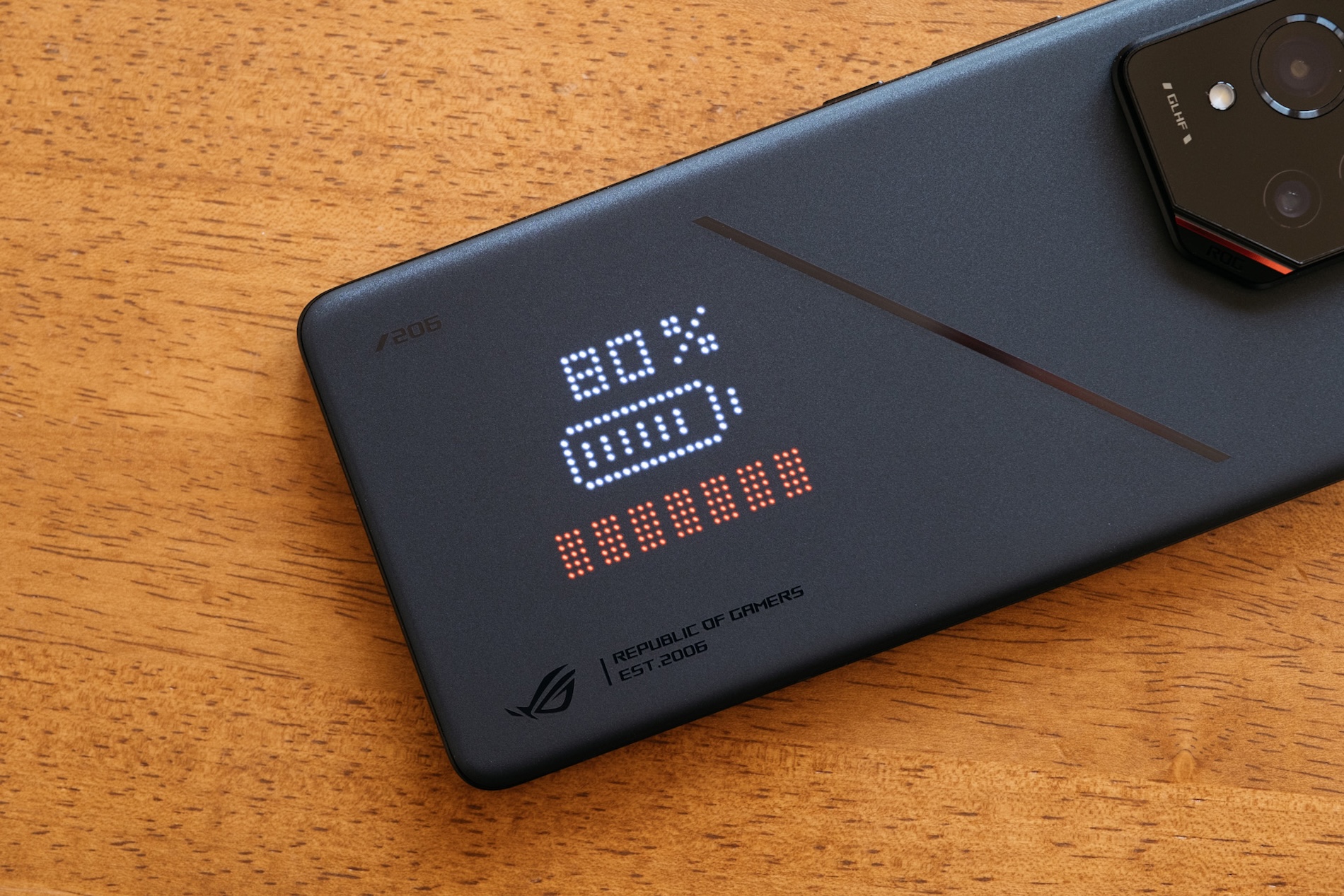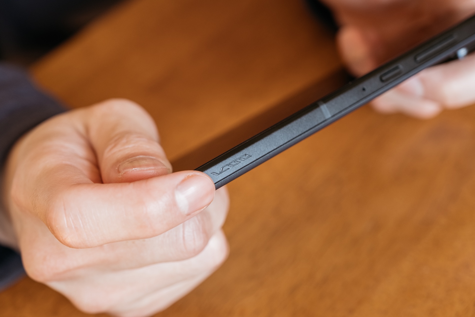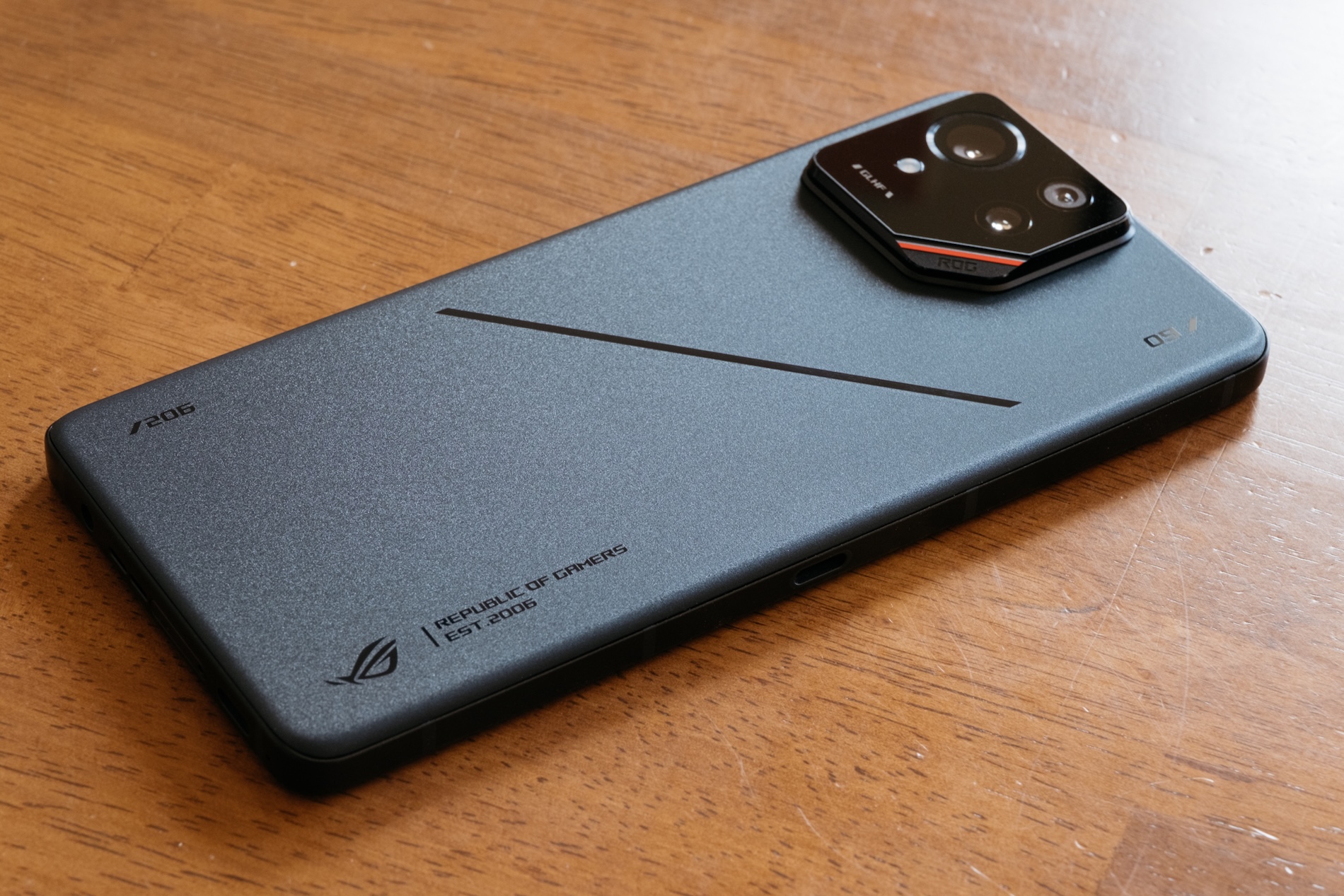 背面はラフな質感で、シックな佇まい。前モデル『ROG Phone 8』シリーズのデザインを踏襲しており、ゲーミングスマホでありながら日常使いにも映える落ち着いた雰囲気を放っている。