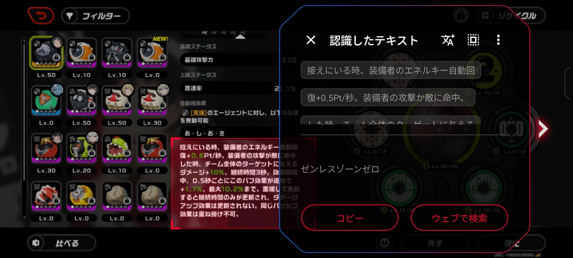 最後は「AI Grabber」を紹介しよう。これは画面内のテキストをAIに検知させ、コピー可能なテキストとして扱えるものだ。上記のように長い説明文をAI Grabberで検知させれば、一部分をコピペしてブラウザで検索することができる。読み方がわからない人名や装備の名前などを調べるにはうってつけだ。