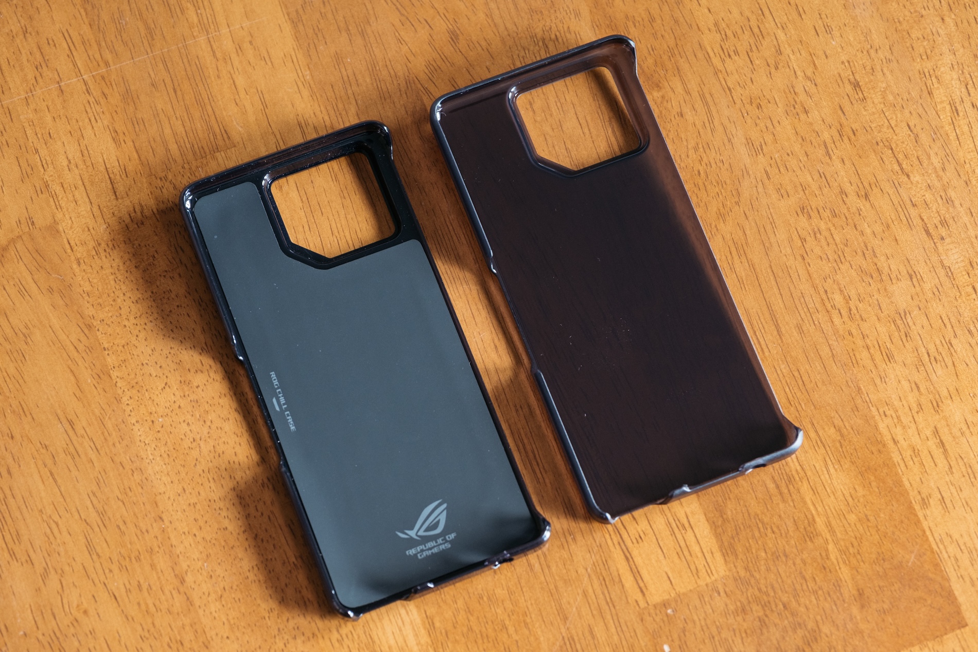右に置いた同梱のケースと比較すると、『ROG Phone 9 CHILL CASE』の内面には熱効率をアップさせるシートが貼り付けられている。触るとわずかにヒンヤリしており、スマホ本体の放熱性向上に繋がる仕組みだ。