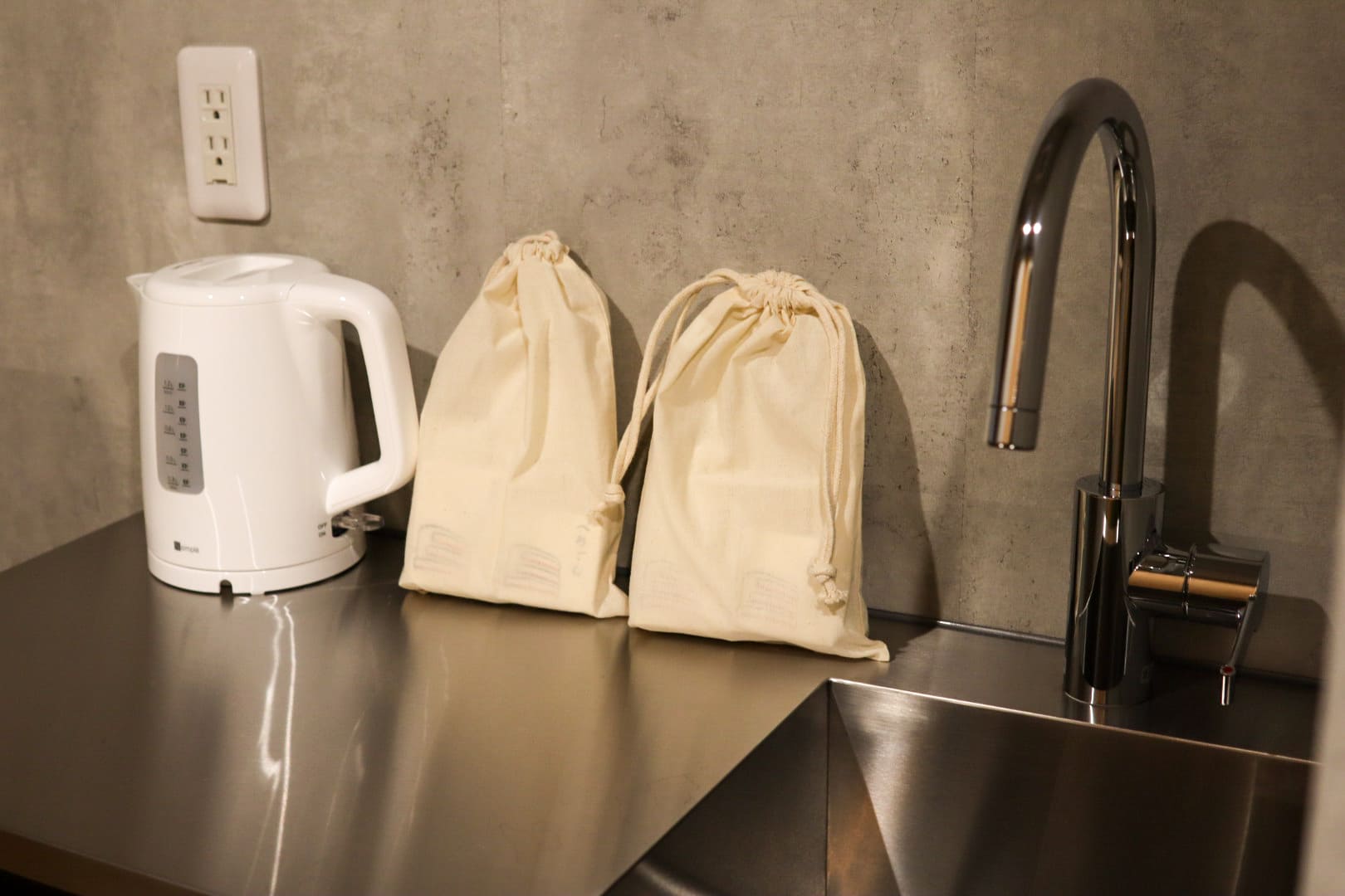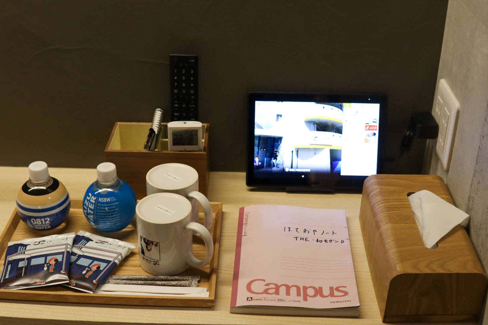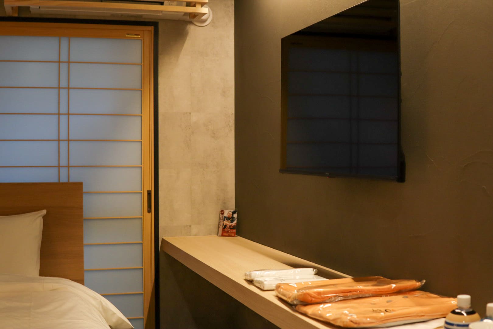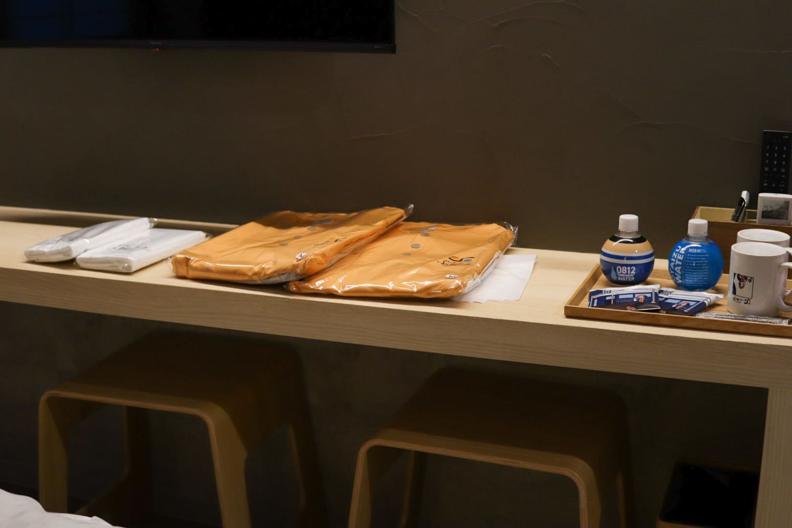 さっそく部屋に入ってみると、綺麗に並べられたアメニティや予約していたグッズがお出迎え。お部屋は清潔感があり、細部までこだわりが感じられます。入ったときにはすでにエアコンがついていて快適な室温になっているのも、細かいですがホスピタリティを感じました。