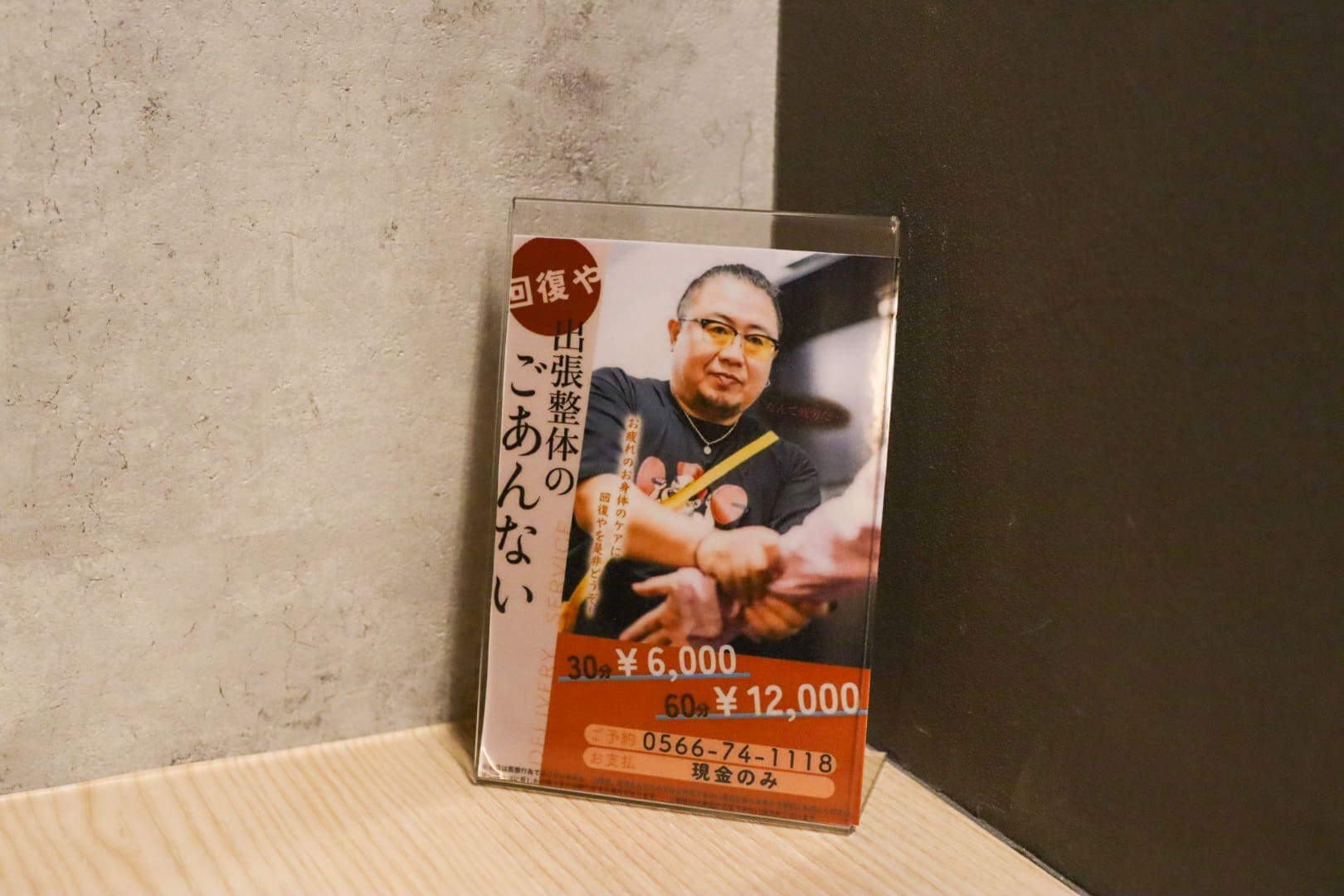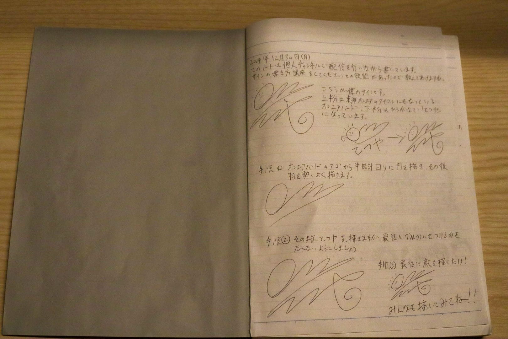各部屋には「ほておやノート」があり、泊った人が自由に感想を書き記しています。1ページ目にはてつや社長によるサインの書き方があり、筆者もサインを習得しました。部屋の隅には動画でおなじみ“回復や”さんの出張整体のごあんないもありました。