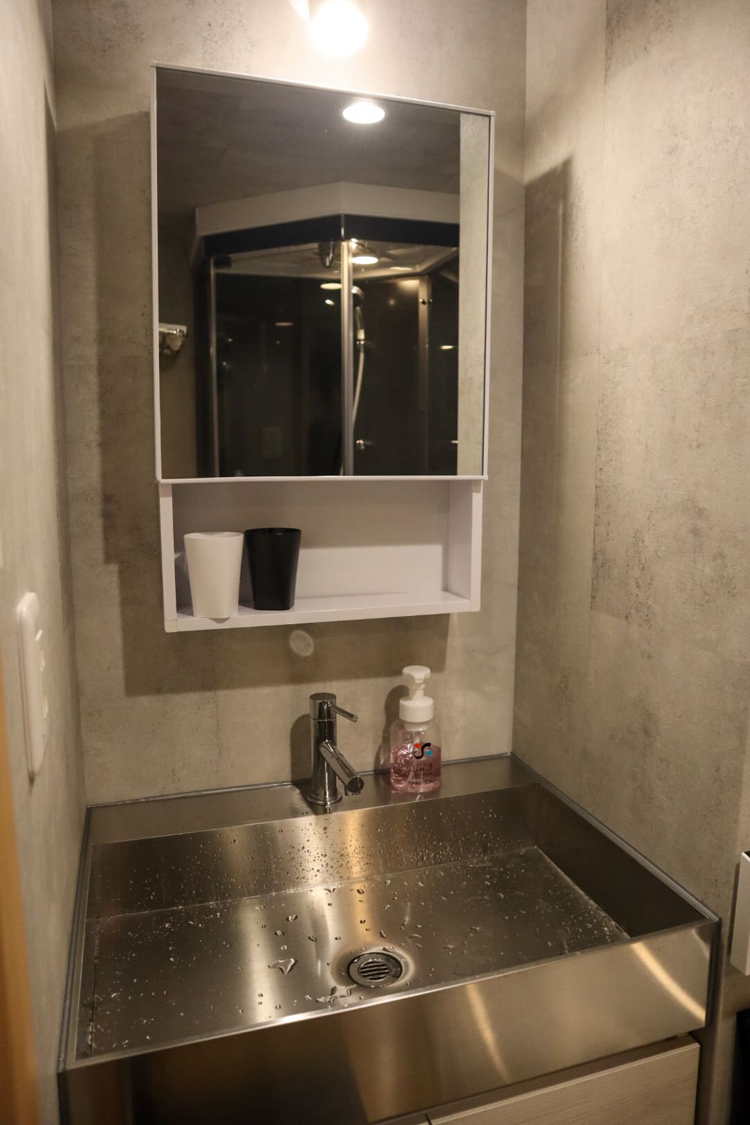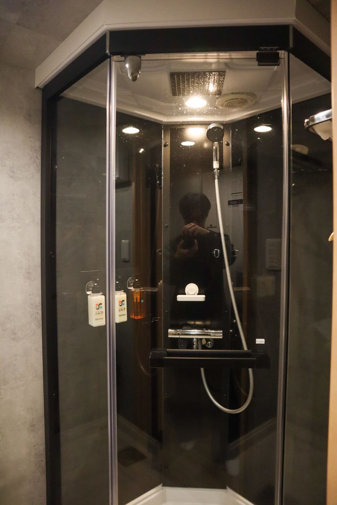 シャワー室はとてもおしゃれで、レインシャワー(天井から降り注ぐシャワー)もついています。浴槽はありませんが、温かいレインシャワーを浴びればお風呂欲はかなり満たされると思います。ホテルのシャンプーやボディソープの泡立ちが悪いのはホテルあるあるだと思うのですが、専用ボトルに入ったシャンプー・ボディソープは筆者が家で使っているものよりも泡立ちがよく、いい匂いだったので持って帰りたくなるほどでした。鏡やカップを置くスペースがあって使いやすい洗面台がシンクと別にあるのも良かったです。