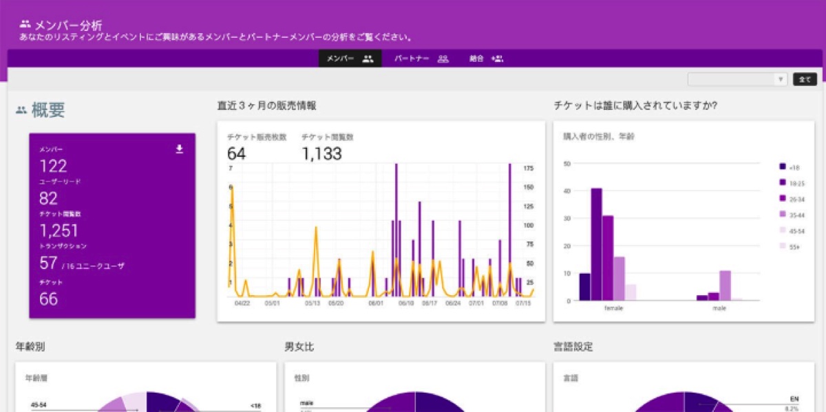 そして、イベント主催者の管理画面では、チケット購入者の属性や統計のデータをリアルタイムに可視化できるため、数字にもとづいた販促企画に活かせるのもZAIKOの特徴となっています。