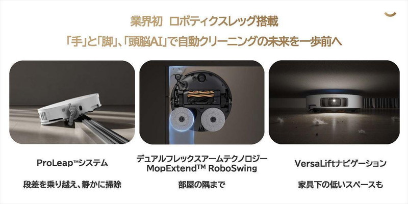 肝心の掃除性能はというと、モーターの最大回転速度を90,000回転/分まで向上、過去最高の最大20,000Paの吸引力を実現した。さらにサイドブラシと回転式モップが伸縮式となっており、部屋の隅や角のゴミ・汚れを除去する。