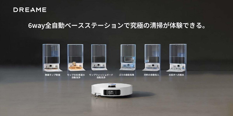 付属するベースステーションは、ロボット掃除機本体からボミを自動収集するだけでなく、水拭きタンクへの給水、水拭き用洗浄液の自動投入、回転モップの80℃温水自動洗浄、熱風モップ乾燥、モップウォッシュボード自動洗浄と6つの機能を搭載する。