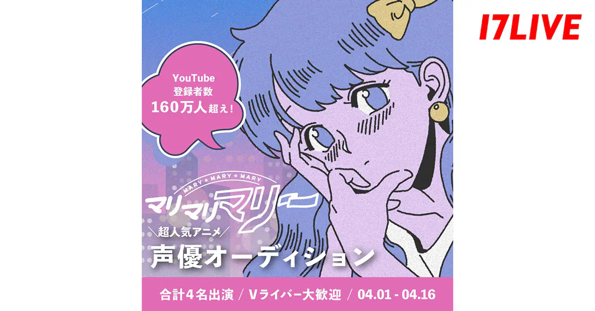 17LIVE、YouTubeとTikTokを中心に人気を博すアニメチャンネル「マリマリマリー」とコラボレーションしたオーディションイベント、『大人気YouTubeアニメ“マリマリマリー”声優オーディション』を、本日2025年4月1日より開催中だ。