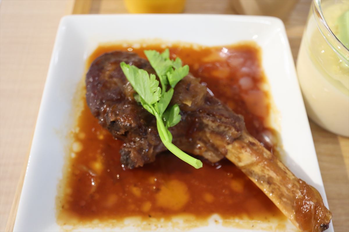 ⑩のラムチョップの新玉ねぎとバルサミコソースは、圧力値70kPaで15分間調理。圧力値を変更できるので、水分の多い新玉ねぎも溶け切らずに形を残し、その旨味を楽しめる。玉ねぎはケルセチンによる抗酸化作用、羊肉に含まれるカルニチンは脂肪燃焼を助け、代謝を高める効果が期待できる。