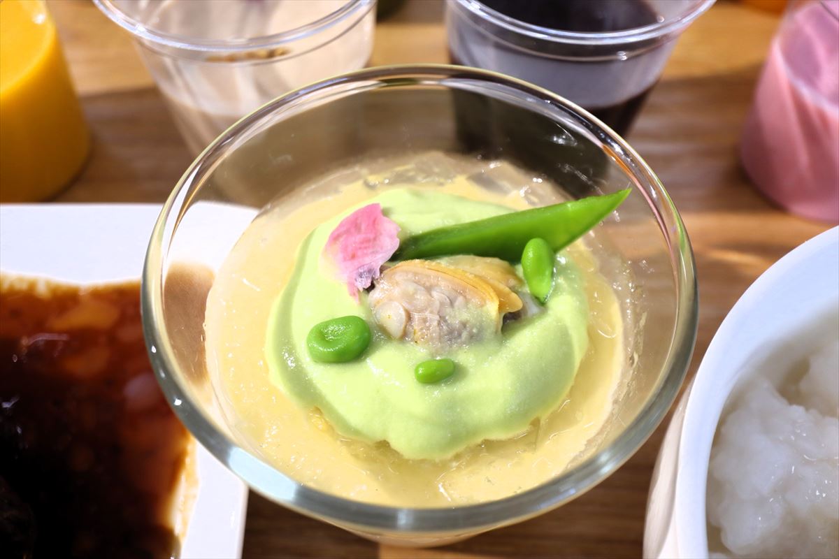 ⑪のアサリのロワイヤル(洋風茶碗蒸し)〜スナップエンドウのムース添え〜は、茶わん蒸しレシピをアレンジしたもので、アサリの出汁と牛乳・生クリームで濃厚に仕上げた。アサリに含まれるタウリンは体内の老廃物を排出する効果があると言われており、また、豊富な鉄分とビタミン812により代謝の向上が期待できる。スナップエンドウは食物繊維が豊富。㉂のラムチョップと合わせてデトックスが期待できる。