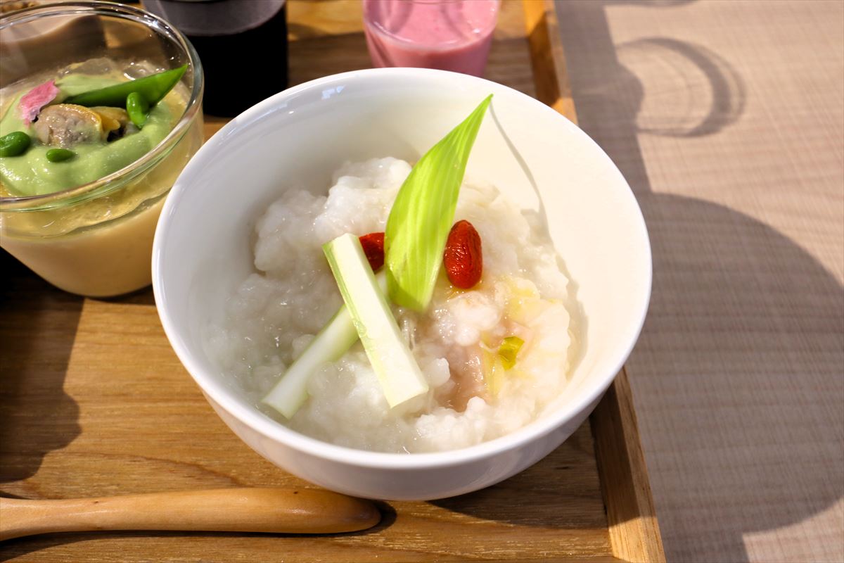 ⑨のホタテとうるいの薬膳粥は朝食にぴったりのレシピ。1時間ほど浸した米に、水、ホタテ缶、レンコン、長ネギ、生姜、鶏ガラスープを入れて「薬膳8 もっと」コースで調理。調理時間は40分。仕上げにうるいとクコの実をトッピング。薬膳料理と聞くと味気なかったり、薬っぽいイメージがあったりするが、このレシピはほんのり味がついていて食べやすく、お腹にやさしい。ホタテとうるいの薬膳粥は、ビタミンCと食物繊維が豊富なうるいがアクセントになっている。