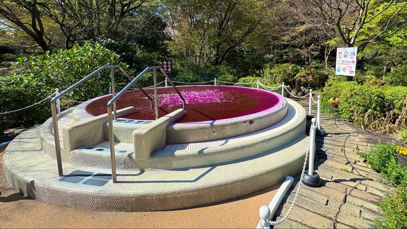 そんな庭園の一角で存在感を放っていたのが、今回のコラボの目玉とも言うべきコラボ風呂「31Aの湯」。お湯の色は鮮やかなワインレッドで、甘く上品なベリー系の香りが爽やかに漂い、心身の疲れを癒やしてくれる。