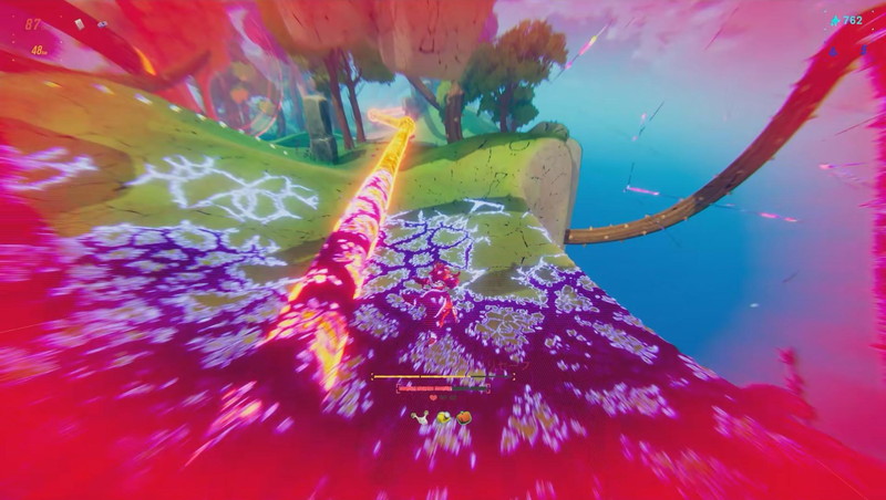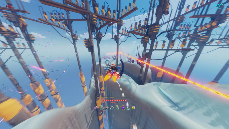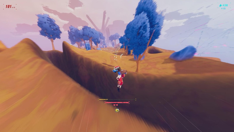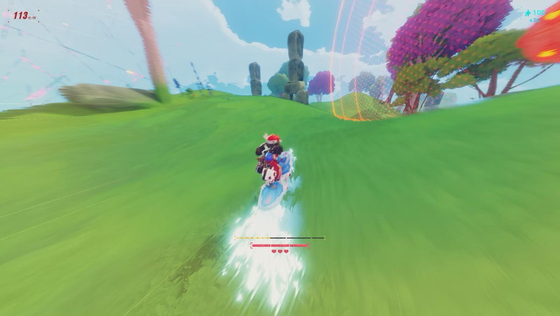 タイトルのとおり、ゲームテンポがとにかく速い。ゲーム開始時の速度はゲーム中表記で秒速100メートルだ。あまりの速さに面食らうかもしれないが、ビジュアルとサウンドですぐに気持ちよく飛べるだろう。画面はアニメ調のモデルと配色で、速度演出のモーションブラーがかかっていても視認しやすい。BGMはアップテンポのエレクトロビートやドラムンベースで心がおどる。主人公のゾーイちゃんがジャンプのたびに歓声をあげてくれる、というリアクションもノレるポイントだ。