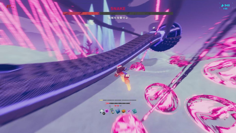 以上のローグライト様式で、プレイヤーの熟達をうながしつつゲームが難度を調節する(アンロック強化でクリアしやすくなる)。ボスバトルはその調整弁だ。広大なフィールドにいる大きな機械を探し、体当たりしてダメージを与える、というバトルで初見殺しの攻撃パターンが多い。ライフを失わずに道中を突破できたならボス攻略しやすくなる。
