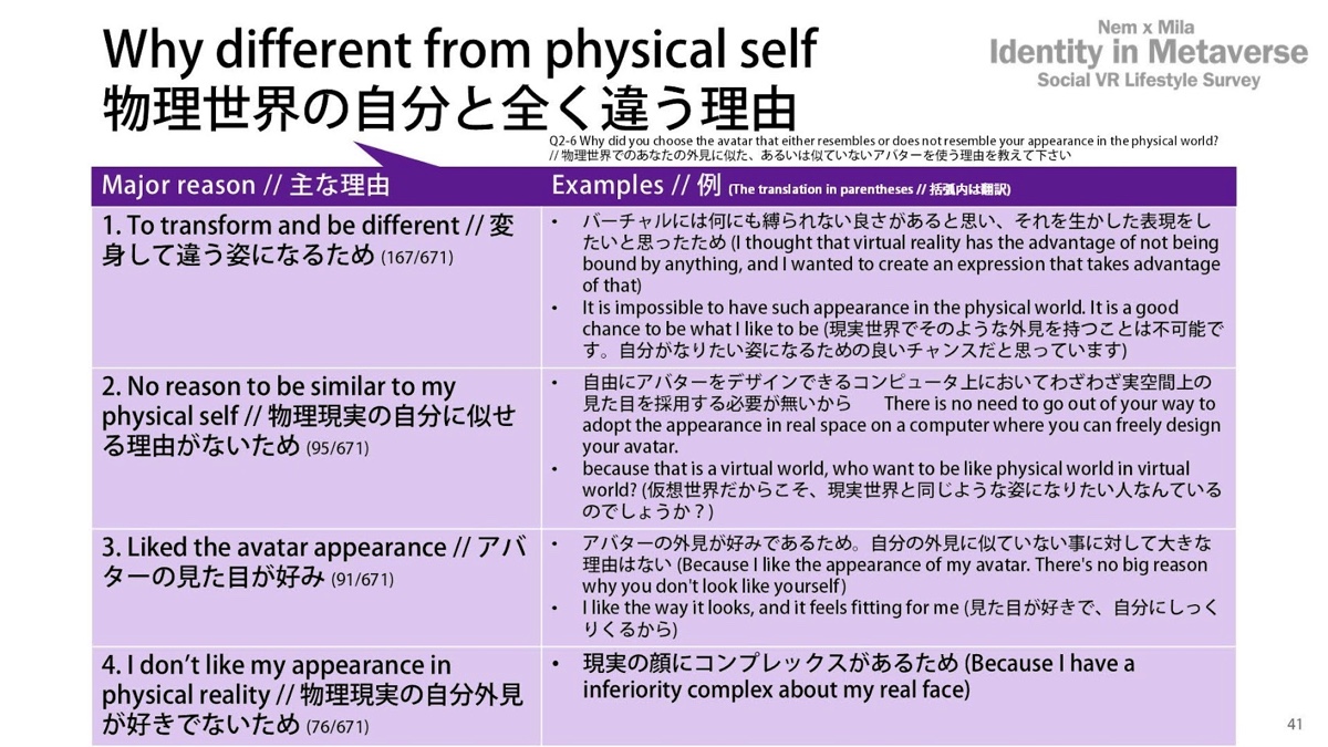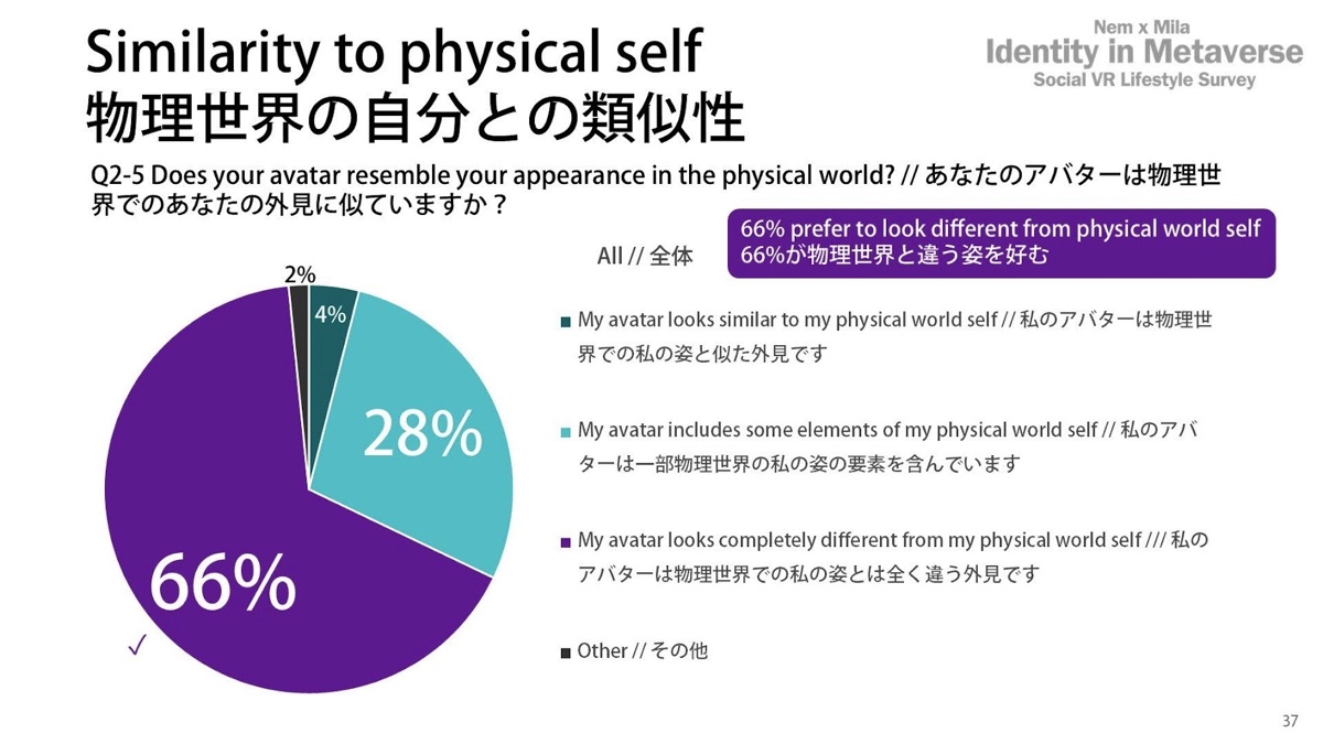 まずは「見た目が現実の姿に似ているかどうか」と質問したところ、28%が「ある程度現実の自分を反映している」、4%が「現実の自分と完全に同じ」、66%が「現実の自分とはまったく違う」と回答しています。現実に寄せている理由として「没入感を高めるため」と答えた人が多かった一方で、「違う姿にした方がメタバースに没入できる」と感じている人もいました。現実に似た姿で没入感を得る人もいれば、違う姿の方が没入できる人もいるということがわかります。興味深いですよね。