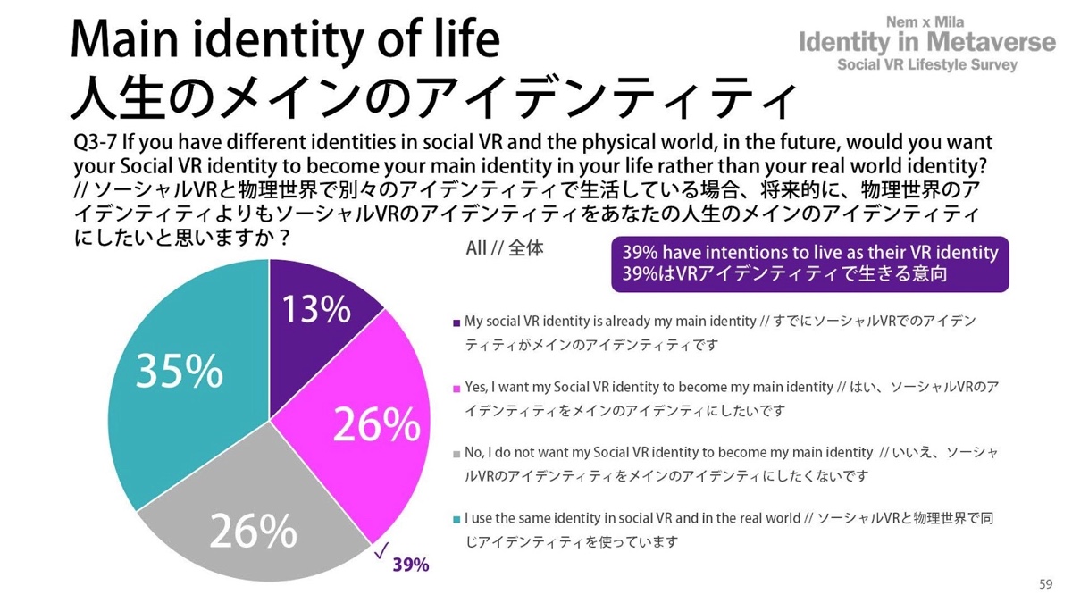 次のデータを見てみましょう。「メタバースの世界でのアイデンティティを、人生のメインアイデンティティにしたいですか?」という、究極の問いを投げかけてみたんです。結果は結構割れて、13%が「すでにVRのアイデンティティがメインである」、26%が「いずれそうしたい」と回答しています。合計すると39%の人が「メタバースのアイデンティティをメインにして生きたい」と答えているんです。 一方で、26%が「メインにするのは避けたい」と感じていて、さらに35%が「現実世界とメタバースのアイデンティティを混ぜて使っている」と回答しています。