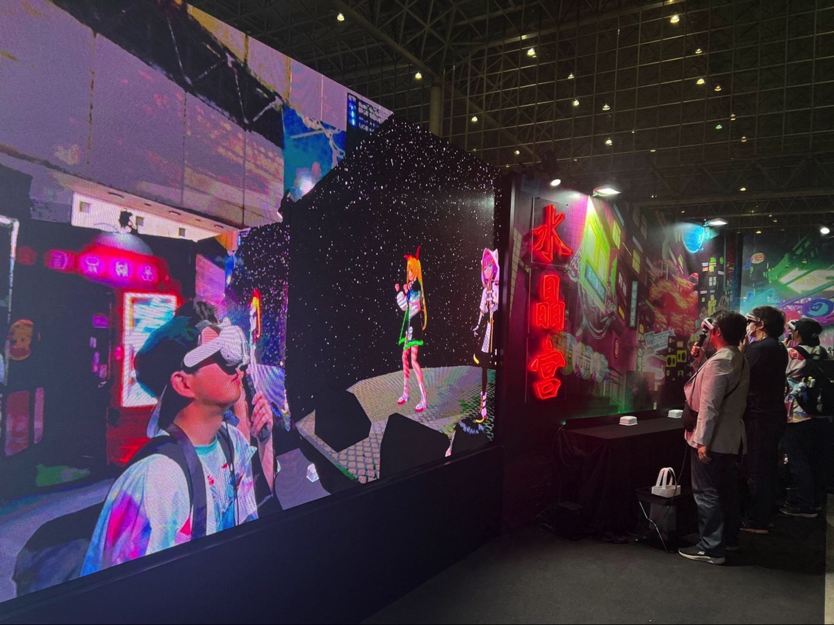 まず紹介したいのは「アイマリン VRLIVE体験コーナー」。こちらは常設アトラクションだったのだが、筆者が訪れた早い時間帯からすでに20名弱の列が。内容としては、アイマリンとイチカゼロ(CV:佐伯伊織)が歌唱する「Frustration」のライブ映像を、VRヘッドセット『Meta Quest3』を使用して、仮想現実空間でリアルに体感できるというもの。ヘッドセットと言いながら、この日の体験装置にはグリップが装着されており、被らずとも手持ちの状態でカジュアルなVR体験をできるというのが、参加への敷居を大幅に下げてくれている気がした(やはり、しっかり被って髪型やメイクが崩れたりすることや、不特定多数の人と同じものを被るのに、多くの参加者は抵抗があるだろう)。