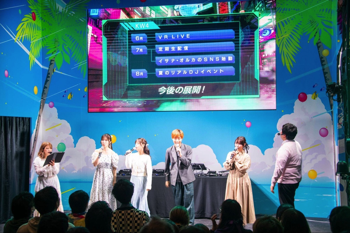 とここで、本稿冒頭に記した今後の“コンテンツ展開”に関する詳細がついに明らかに。まずは、小説版に登場する、アイマリンら所属の反体制組織をモチーフとしたコンセプトファンクラブ「自由機甲楽団」の結成を発表。同時に、新キャラクターとしてオルカ(CV:松岡洋平)とイサナ(CV:砂田理子)が登場し、それぞれ楽団員=ファンを指揮する、団長と副団長の役目を任されているという。彼らは今夏より、公式Xアカウント開設や生配信を実施するほか、同時期にはリアルDJイベント開催も予定されているとのこと。