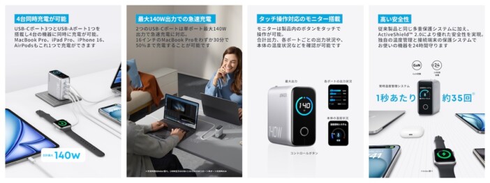 アンカー・ジャパン株式会社は、ノートPCにも対応する高出力のUSB急速充電器『Anker Charger(140W, 4 Ports)with USB-C & USB-C ケーブル』を2025年5月8日より販売開始する。