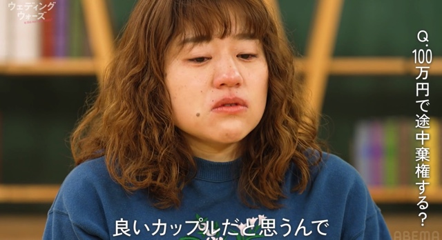 ちなみに、『ウェディングウォーズ』には最初に別れを決断したカップルが100万円をもらえるというルールがある。「柴助と別れて帰ろうか……」と悩んだ時も、マミモンは「柴助とわたしで50万円ずつ」と話していた。正直、向こうが浮気したせいで別れるんだから、全額もらってもいいのでは? と思ったが、本当にマミモンは愛が深い人なんだと思う。『第1回脱落デスマッチ』で、愛の30秒キス(※カップルのどちらかがタイマーのスイッチを持って、30秒ピッタリを目指してキス。最も30秒から離れていたカップルが脱落する)をする前も、「ここで終わったら、仲悪いまま帰ることになる。絶対に残りたい」と言っていたし、どうしても柴助に対する情が消えないのだろう。