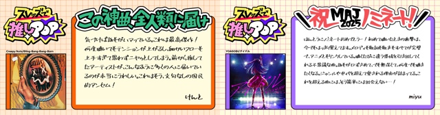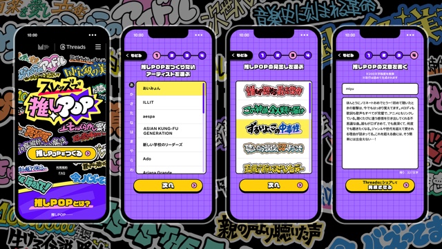 今回のキャンペーンでは、お気に入りのアーティストの楽曲がMUSIC AWARDS JAPAN 2025にノミネートされている利用者に向けて、CDショップの店頭で見かけるPOPのような画像を簡単に作成できる特設サイト(https://maj2025-threads-oshipop.com)を用意。完成したPOPをThreadsに投稿することで、ファン同士で推しへの思いを共有して盛り上がったり、アーティストや楽曲のことを知らない人に魅力を広めたりすることができる仕組だ。