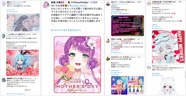 VTuber業界では、キャラクターデザインや立ち絵を担当したイラストレーターを「ママ」と呼ぶ文化がある。今回は、「母の日」にちなんで、“もう一つの母の日”として、Vライバーの生みの親である「ママ」に感謝する企画を実施した。