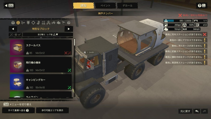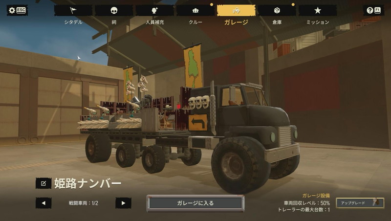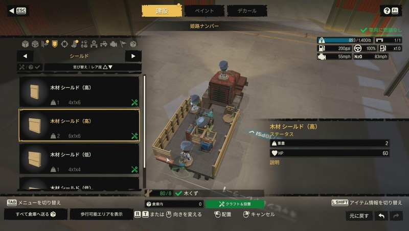 もうひとつは定型パーツを組み合わせる手法である。車両の後部やコンテナ、飛行機の胴体などを荷台におけば弾よけになる。あとは隙間を活用すればよい。この、定型パーツからデザインのアイデアを得る仕組みにはゲーム序盤で大いに助けられた。廃品を利用した世紀末サバイバルの風情も味わえる。