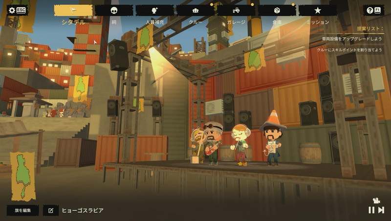 時と場所は文明崩壊後の荒野、バッドランド。ラスボスの弁士族に扇動され、各地の賊徒は乱暴の限りを尽くしていた。プレイヤーが属する拠点シタデルはその戦乱を収めるべく、賊徒の拠点を制圧し弁士族に立ち向かう。という経緯から、街画面でミッションを受け、フィールド画面で武装トラックを運転・戦闘する。