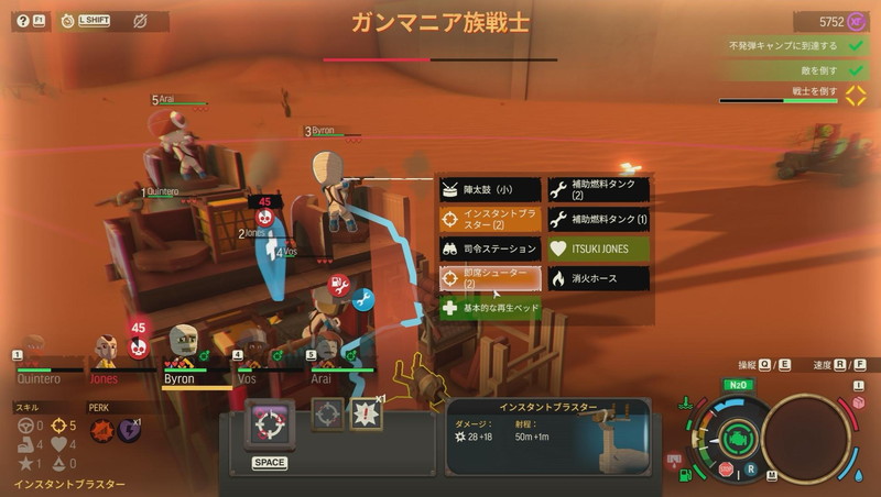 本作の醍醐味たるエディット要素は導入がマッドだ。ゲーム最序盤は武装トラックの荷台がフラットで遮蔽物がない。当然、敵族の銃弾にさらされてクルーは傷つき装置も壊れる。危ない目にあった経験からエディットに何が必要なのか学べるのである。弾よけを用意し、銃座の向きを決めよう。