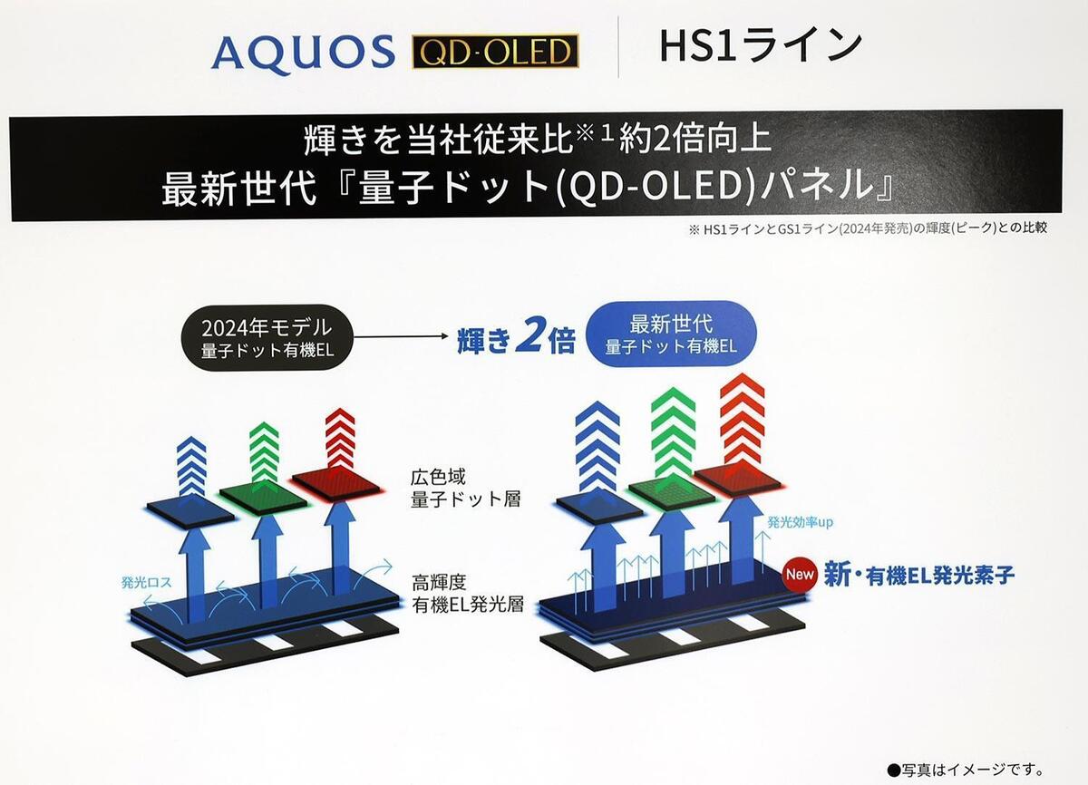 ここからは新製品について紹介していきたい。まずは、4K有機ELテレビのフラッグシップとなるQD-OLEDのHSラインから。これは、有機ELパネルに、最近流行の鮮やかな色再現を可能にする量子ドットを組み合わせた製品。パネルについては上述したように2025年の最新世代を搭載しており、発光部に周辺への迷光を抑える衝立のようなものを形成することで、光を正面へ効率よく集めることができるようになり、結果、従来よりも明るい映像の再現が可能となった。そして、独自の映像エンジンによる精緻な駆動制御の組み合わせで、上に書いたように前モデル比で約2倍の輝き感を実現したとしている。