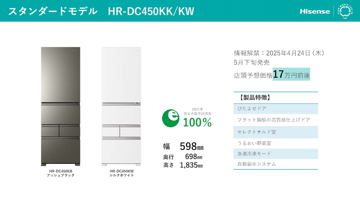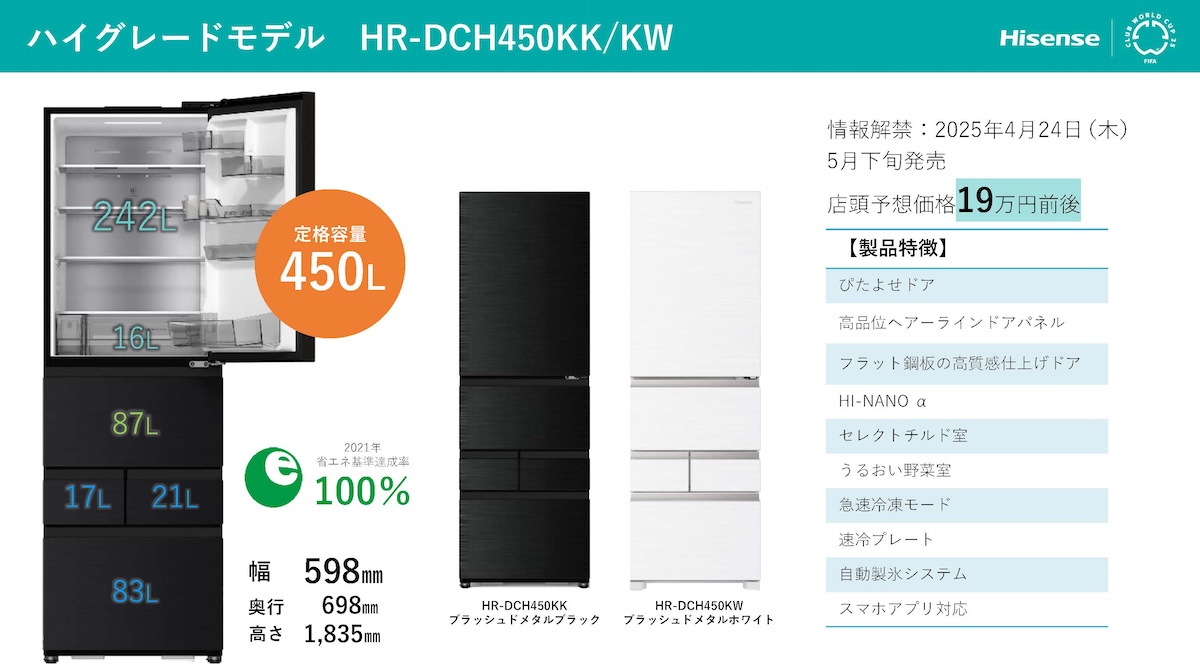 5月下旬に発売するのは、450Lクラスの冷凍冷蔵庫ハイグレードモデル『HR-DCH450』(実売価格19万円前後)とスタンダード『HR-DC450』(同17万円前後)の2機種。中国メーカーが日本国内で450Lクラス5ドアモデルを発売するのはこれが初めてだ。