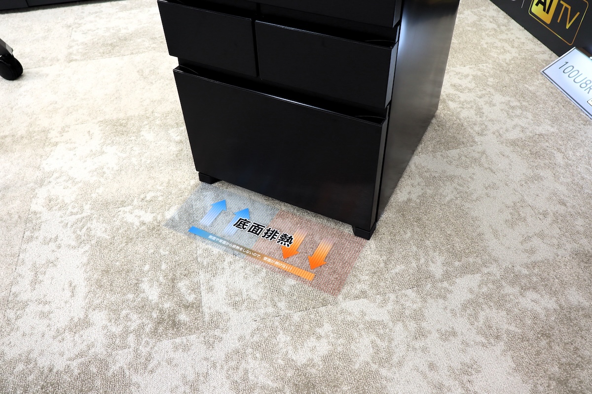 ハイセンスの新製品は底面に排熱機構を搭載し、側面・上面からの放熱をなくした。この結果、側面の空きスペースは最小3mmまで縮小。ぴたよせドアと合わせて、より狭い空間に冷蔵庫を設置できるようになったのだ。なお、上面の空きスペースは50mmで変わらず、背面は0mmでぴったり壁につけられる。