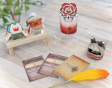 オトモアイルーの頭装備(ホープネコ、ダッフルネコ、レザーネコ)をモチーフとしたキュートなマスコット(各2,750円/税込)をはじめ、ラバラ・バリナがモチーフのグラス付きペーパー加湿器(3,300円/税込)、クエスト受注画面をデザインしたクエストカウンターメモ帳(880円/税込)など、デスクの上を彩る小物としてうれしいデザインとなっている。