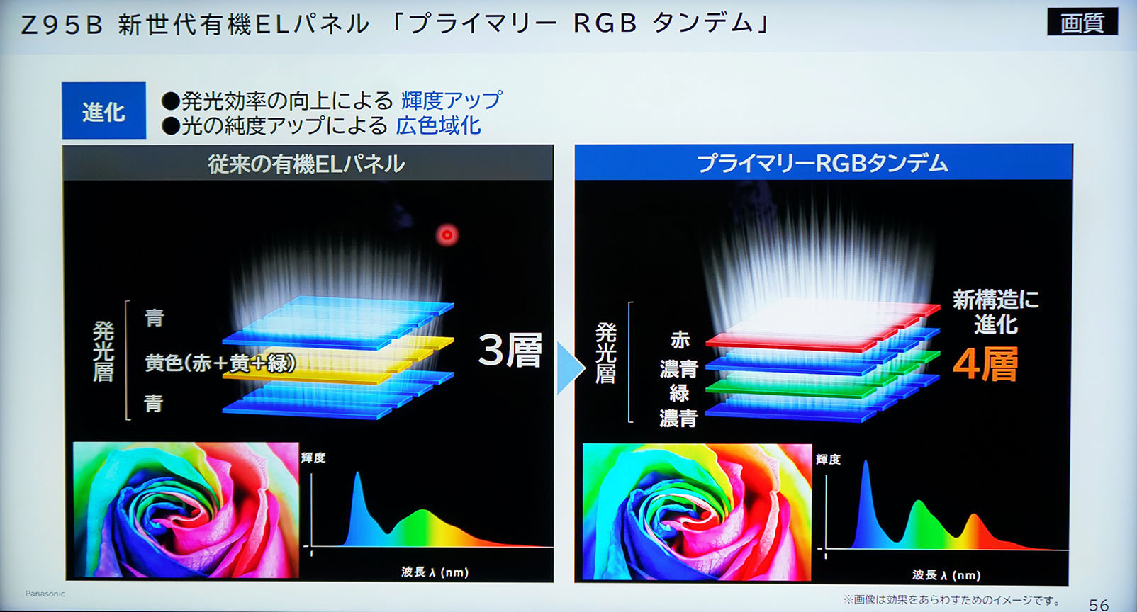 その「プライマリーRGBタンデム」有機ELパネルについて解説すると、「赤/濃い青/緑/濃い青」の4つの有機EL発光層を重ねることで、従来の方式(『青/黄色/青』の3層構造)よりも明るく、色鮮やかな映像が再現できるという。