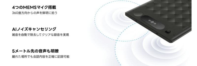 本製品には、4つのMEMSマイクと1つの骨伝導マイクが搭載され、会議や通話などさまざまな場面でクリアな音声を録音できる。また、録音データはWi-FiやBluetooth経由で自動的にNottaアプリに転送され、すぐに文字起こしや議事録作成が可能となっている。