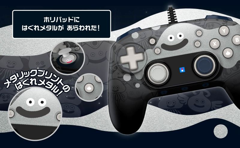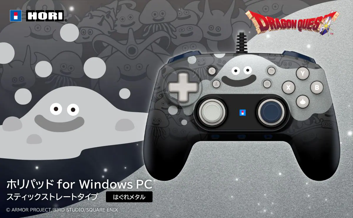 Windows PC 専用のホリパッドに、ドラゴンクエストのはぐれメタルデザインが登場した。メタリックプリントにより、はぐれメタルの金属の質感が演出されている。