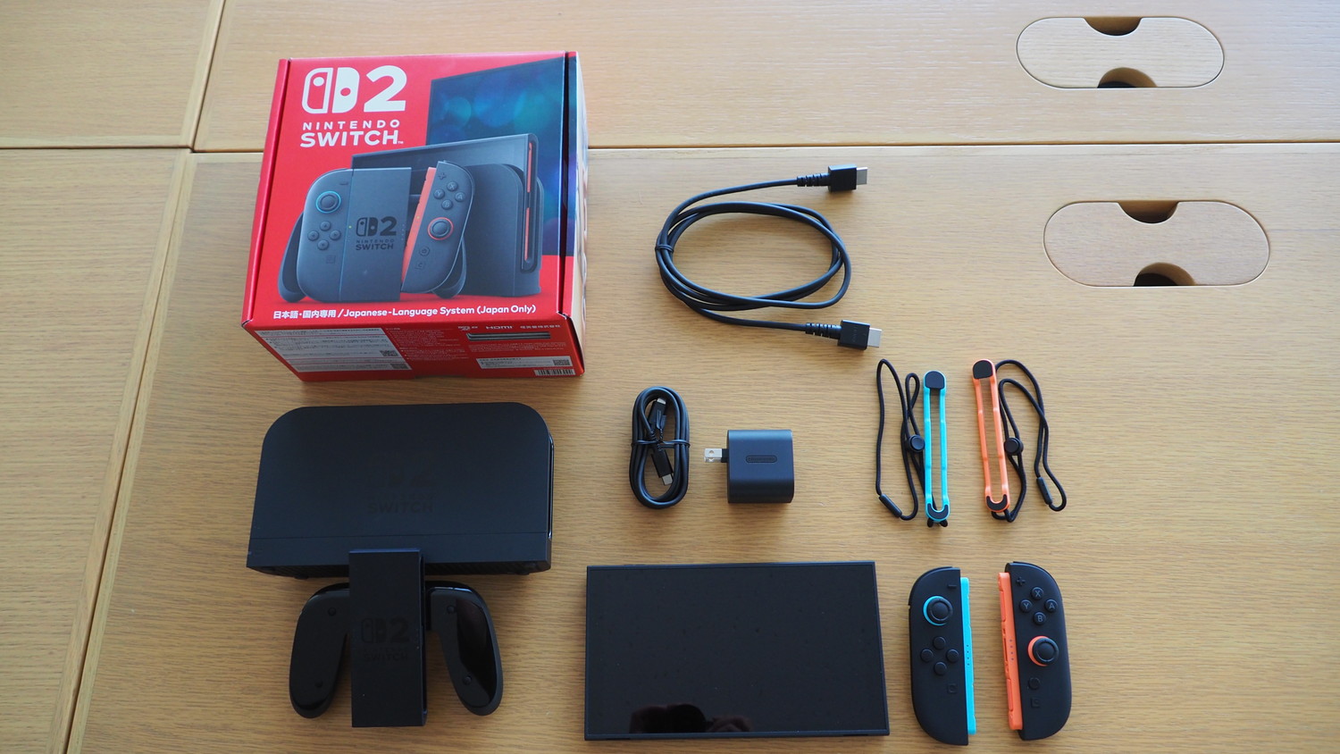 こちらこそが、編集部から最寄りの「ヤマダデンキ LABI渋谷」に足を運び、開店とほぼ同時に最速で入手してきた「Nintendo Switch 2」だ。さっそく本体と同梱物を並べて撮影してみた。