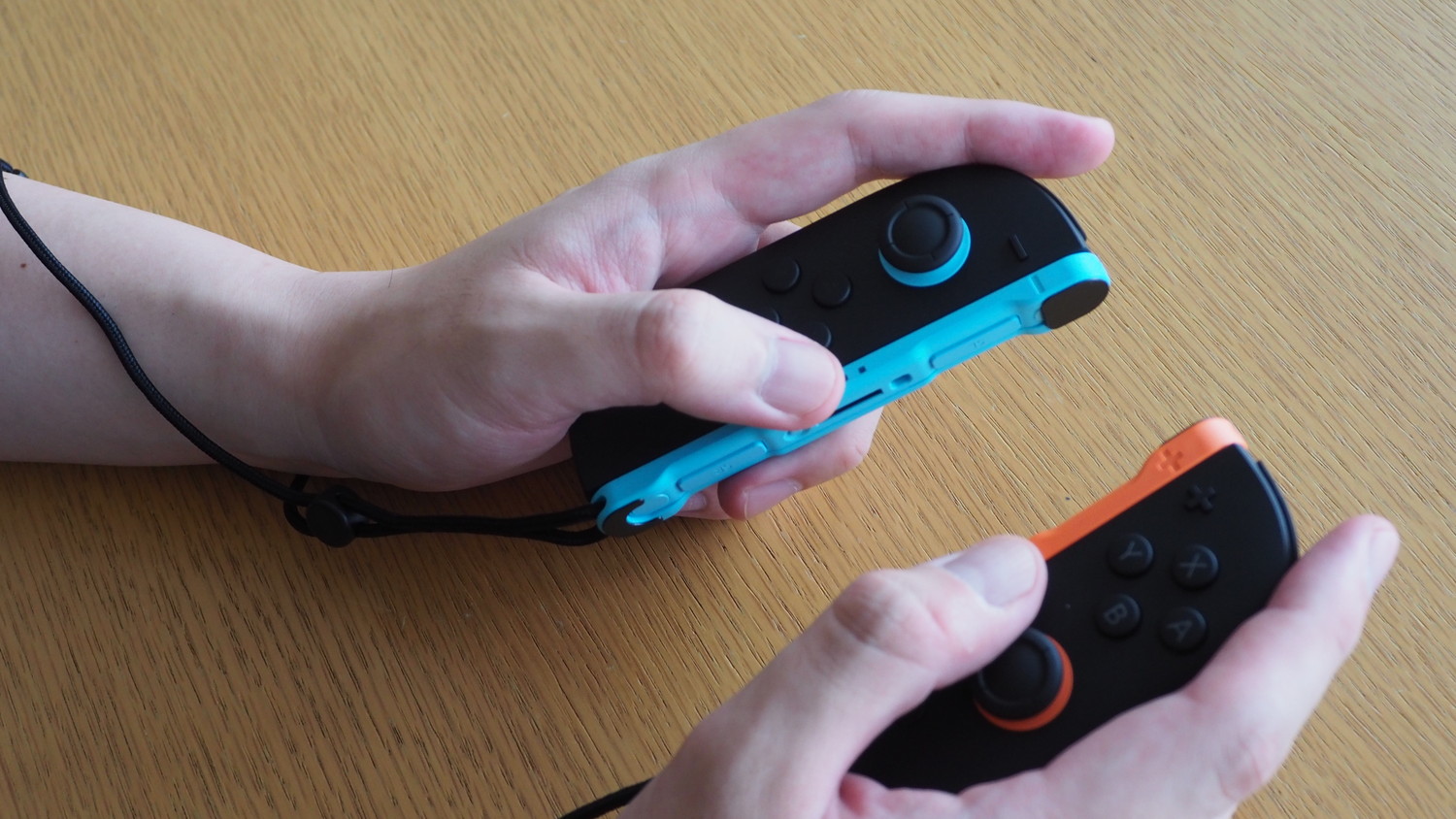 「Joy-Con 2」は本体との接合面を接地させることで、マウスのように扱える新機能を有している。単体でも意外に安定感があることはこちらの記事でもお伝えしたとおりだが、付属の専用ストラップを付けると接地面が大きくなり、さらに安定感が増す。ちなみに専用ストラップは、コントローラ下側の爪を引っ掛けてから押し込むと、上部の爪がパチンとはまってホールドされる。