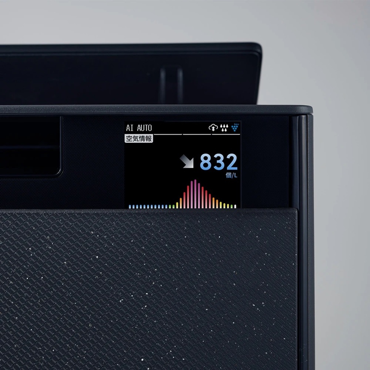 答えは、AIモニターによる空気中の粒子数の見える化。『シャープ 加湿空気清浄機KI-TX100』には、ホコリや花粉の量を数値で表示するセンサーが内蔵されており、リアルタイムで部屋の空気をチェックできる。