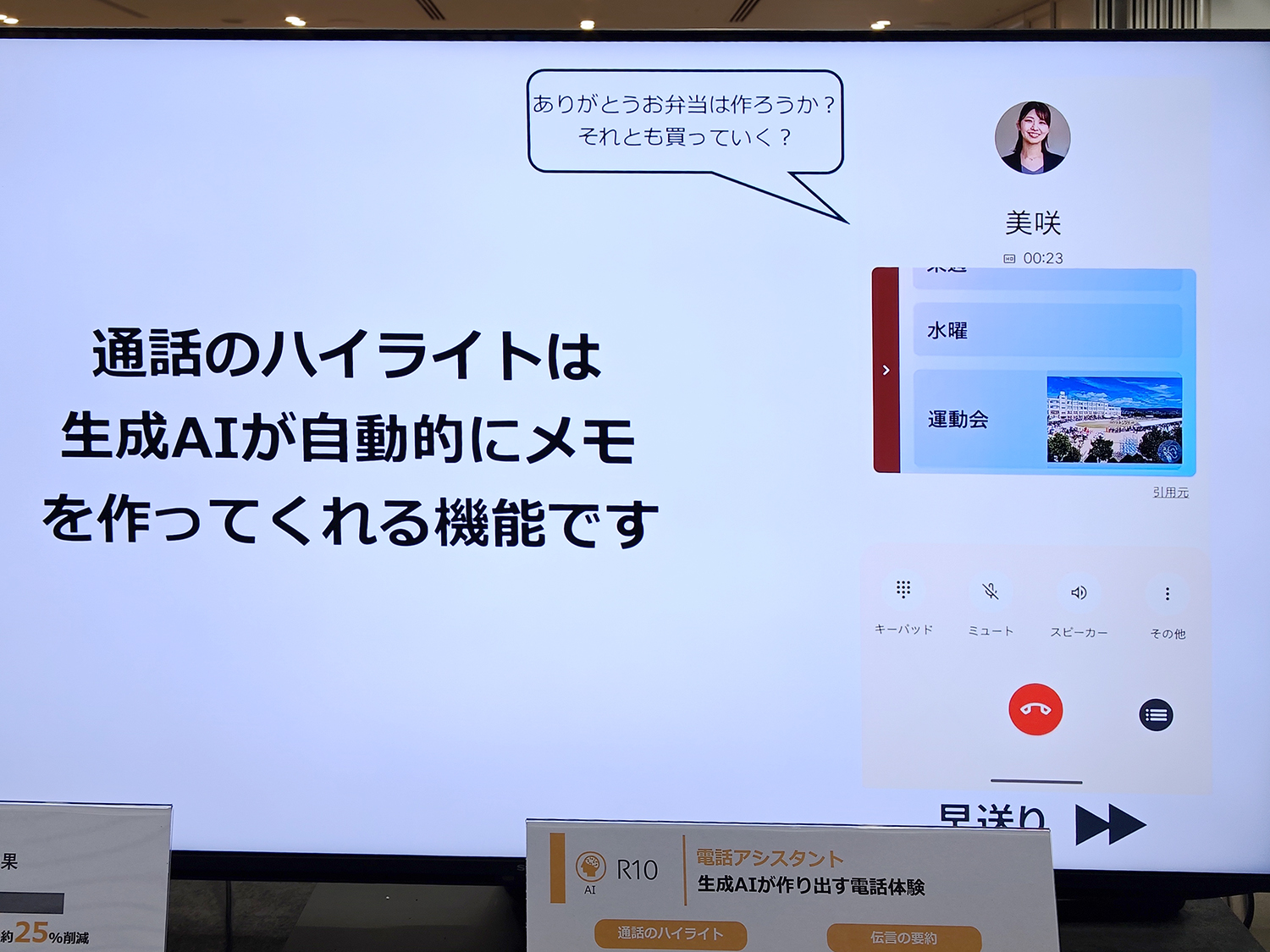 また通話のハイライト機能では、長時間の通話、あるいは録音ファイルから、内容のハイライトを地頭的にメモとしてまとめてくれる。来週のコンサートのことを友人と電話で1時間くらい話したあとで「そういえば何時に集合するんだっけ?」と思い出せないときでも、通話のハイライト機能なら「集合場所」「集合時間」「持ち物」など、会話の中で出てきたトピックだけを取り出し、さらにわかりやすいように見出しの写真を地頭的に付けて一覧で表示してくれる。
