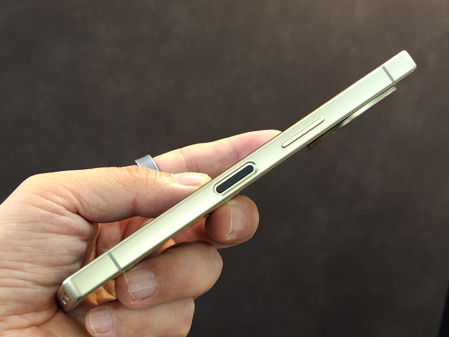 本体サイズは約156 x 約75 x 約8.9mm、重量は197g。側面の電源ボタンには指紋認証センサーも内蔵されている。