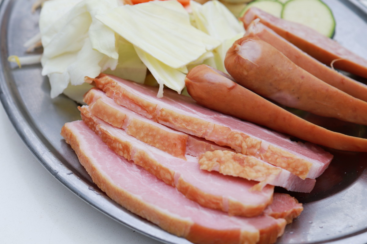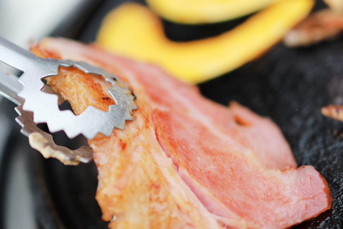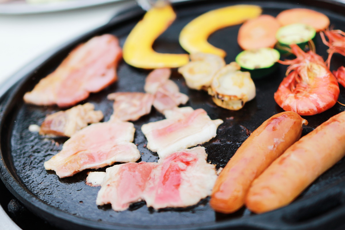 鉄板に火が入ると大気が熱せられ、遠景がゆらぐ。さあそろそろ「乗せ時」だ! 軽くビールでウォーミングアップしながら、胃袋に号令をかける。「セット・ユア・オウン・ステップス!」。