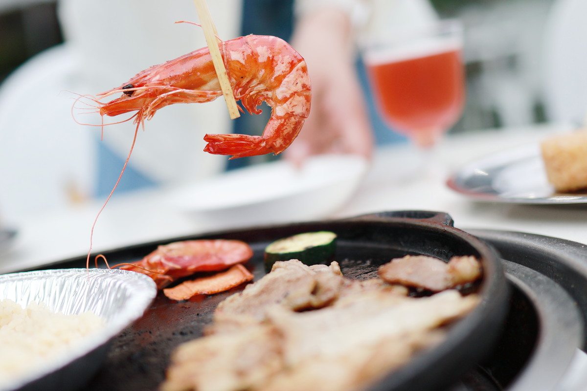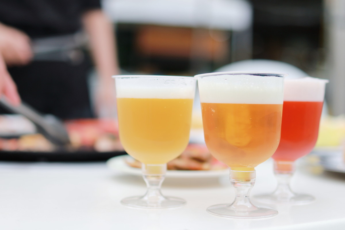 「森ビア」スタッフによって、牛カルビ、豚バラ、味付けラム、野菜、フィンガーフード、そして記念プランならではのシーフードが続々と並べられる。ビールは贅沢にも、ヨーイドンからSVBだ。ラズベリーの液色が美しい「ジャズベリー」と、定番「豊潤ラガー496」、そして「シルクエール 白」である。