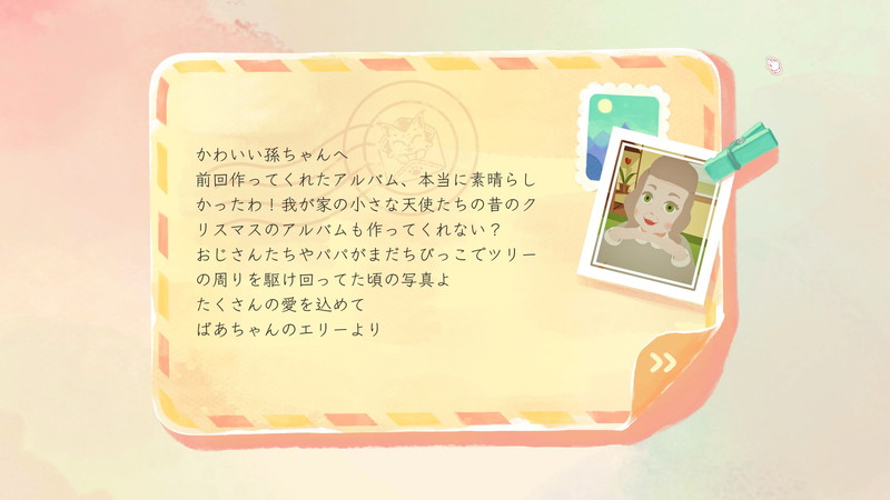 プレイヤーは、手紙の差し出し人のメッセージと写真に収められている光景から、いつ・誰の・どんな場面を写したものかを推測し、写真を時系列順にアルバム上へと並べていくことになる。すべての写真を並べ終わったころには、登場人物たちが紡いだ人生のかけがえのない思い出が、ひとつの物語となって浮かび上がるというわけだ。