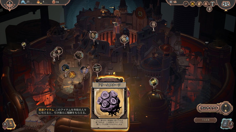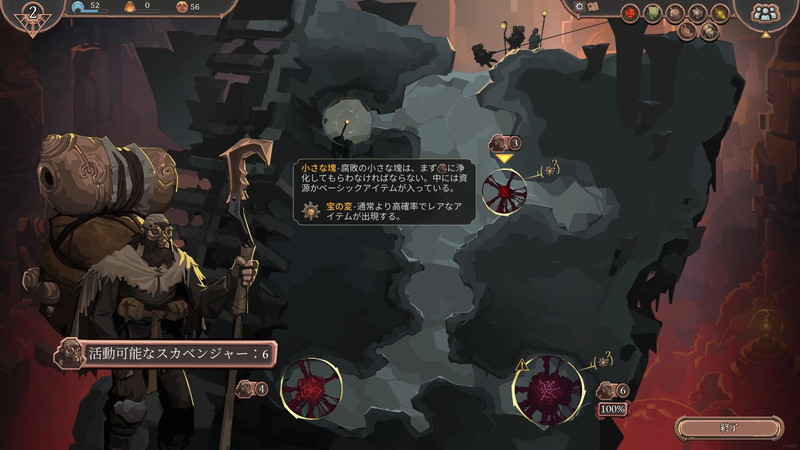 バトル後は「スカベンジャー」の出番だ。彼らは遠征隊にくっついてきた宝掘り人員であり、ここから確定報酬以外の宝物をディグるミニゲームが始まる。ここでなるべく効果の高い資源アイテムを取っておくことで、次のサイクルをより有利に進めることができるし、ちょっとした通貨しか拾えなかった場合は苦戦することになる。